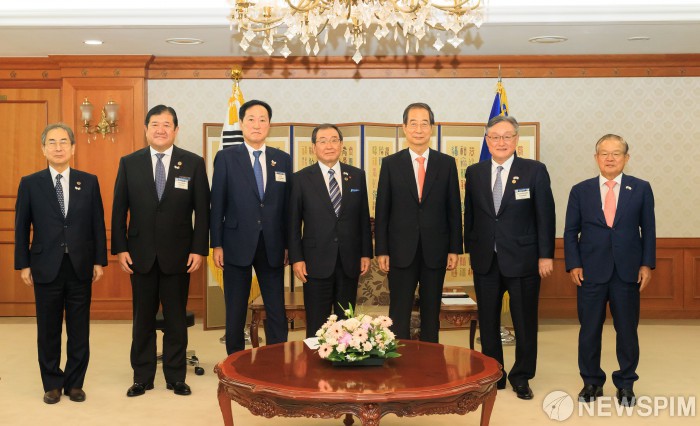 [서울=뉴스핌] 한덕수 국무총리(오른쪽 세번째)가 5일 오후 서울 종로구 정부서울청사에서 일본 경제단체연합회 회장단과 접견, 기념촬영을 하고 있다. [사진=국무총리실] 2022.07.05 photo@newspim.com