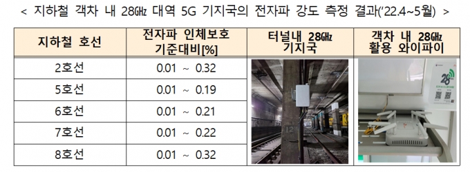 또 한국방송통신전파진흥원이 지하철 터널에 설치된 28㎓ 5G 기지국의 전자파 노출량을 객차 내에서 측정한 결과, 인체보호기준 대비 1%미만(최대 0.32%)으로 나타났다. 또 2호선 성수지선(성수역 ~ 신설동역 구간)에서 시범 서비스 중인 28㎓ 5G 와이파이의 전자파 세기도 인체보호기준 대비 0.01 ~ 0.85% 수준으로 나타났다.