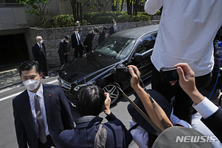 [도쿄(일본)=AP/뉴시스]아베 신조 전 일본 총리의 시신을 실은 것으로 추정되는 차량이 9일 그의 도쿄 자택에 도착하고 있는 모습. 아베 전 총리는 전날 오전 나라시에서 가두 연설을 하던 도중 총격을 받고 병원에 옮겨졌으나, 사망했다. 2022.07.09. |