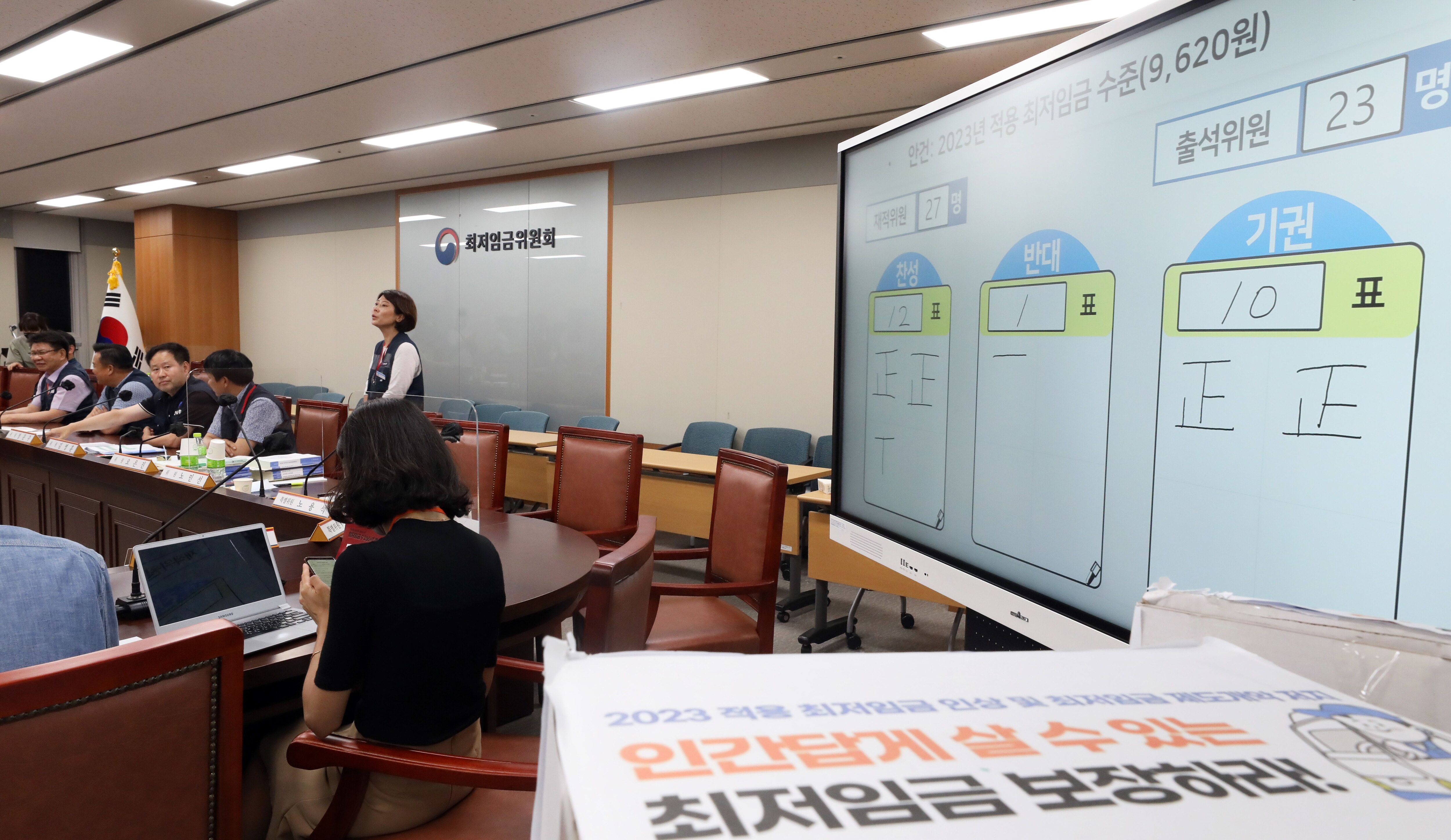 지난달 29일 밤 정부세종청사 최저임금위원회 회의실에서 열린 제8차 전원회의에서 재적 27, 출석 23, 찬성12, 반대1, 기권 10으로 2023년 최저임금이 9천620원으로 결정된 가운데 한국노총 근로자위원들이 표결과정에 대해 입장을 밝히고 있다. /뉴스1 |
