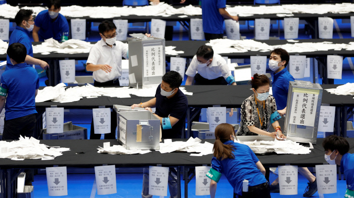 개표 10일 도쿄지역 한 개표소에서 개표요원들이 이날 실시된 일본 참의원 선거 결과를 확인하기 위해 투표함에서 투표용지를 꺼내고 있다. 도쿄 | 로이터연합뉴스 |