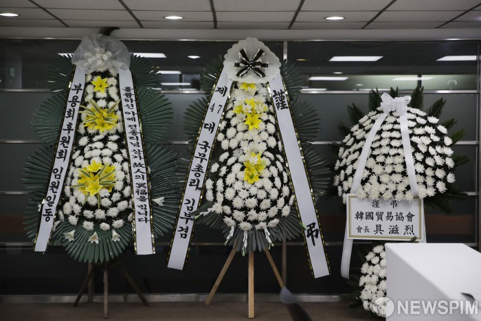 [서울=뉴스핌] 김학선 기자 = 11일 오전 서울 종로구 주한일본대사관 공보문화원에 마련된 아베 신조 전 일본 총리 분향소에 김부겸 전 국무총리의 조화가 놓여 있다. 2022.07.11 yooksa@newspim.com