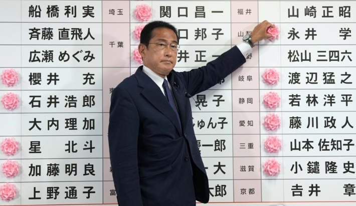 기시다 후미오 일본 총리 겸 자민당 총재가 지난 10일 도쿄 자민당사에서 후보자 이름에 붉은 장미를 달아 참의원 선거 승리를 알리고 있다. 연합뉴스