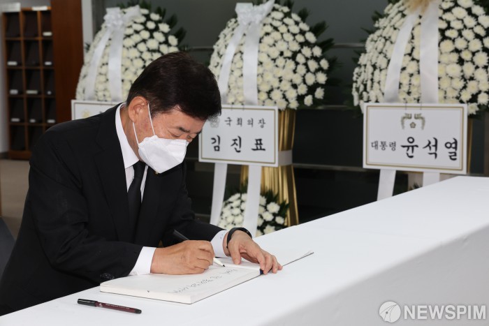 [서울=뉴스핌] 국회사진취재단 = 김진표 국회의장이 11일 오후 서울시 종로구 주한일본대사관 공보문화원 아베 신조 전 일본 총리 분향소에서 조문을 마친 뒤 조문록을 작성하고 있다. 2022.07.11 photo@newspim.com |