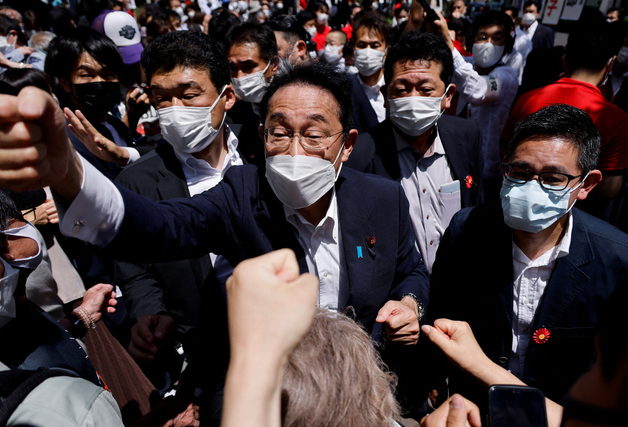 (가와사키 로이터=뉴스1) 이서영 기자 = 일본 집권당 자민당 총재인 기시다 후미오 일본 총리가 도쿄 남쪽 가와사키에서 참의원 선거연설을 한 뒤 유권자들과 주먹다짐하는 모습. (C) 로이터=뉴스1 |
