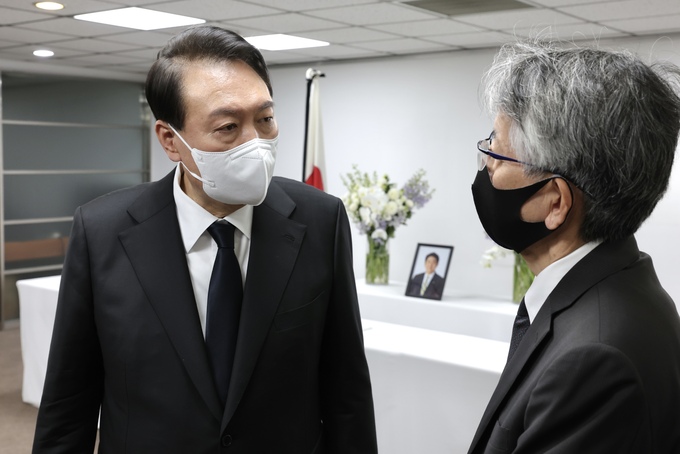 이날 오후 윤 대통령은 분향소가 마련된 종로구 주한일본대사관 공보문화원을 찾았다.
