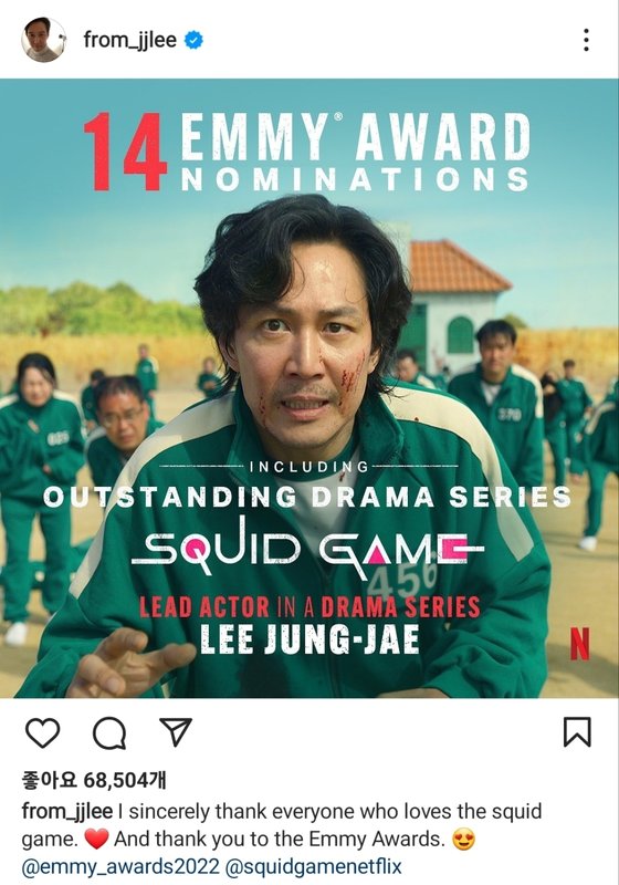 미국 프라임타임 에미상 남우주연상 후보에 오른 배우 이정재는 SNS에 '오징어 게임 14부문 후보 지명' 소식을 전하며 감사를 표했다. SNS 캡쳐 |