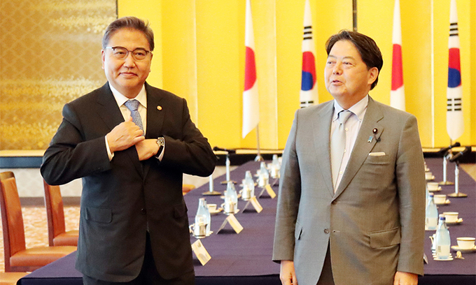 지난 18일 일본 도쿄도 미나토구 소재 외무성 이쿠라공관에서 박진 한국 외교부 장관과 하야시 요시마사 일본 외무상이 회담 준비를 하고 있다. 연합뉴스 |