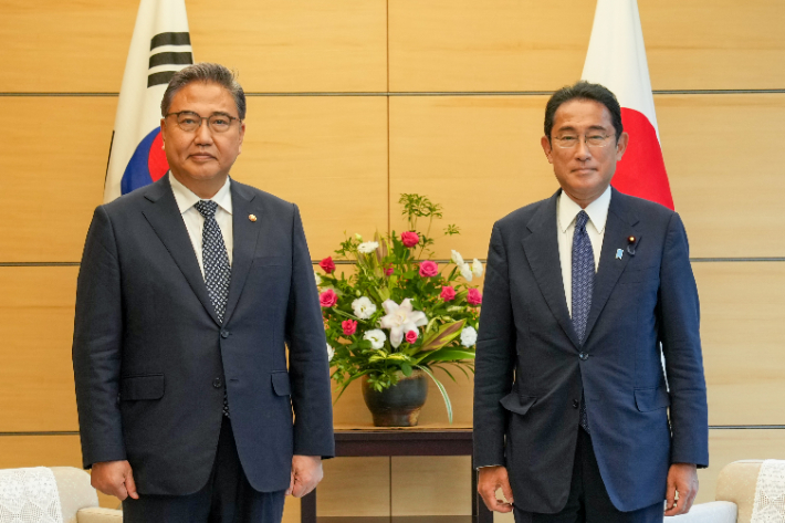 기시다 일본 총리 예방하는 박진 외교부 장관. 연합뉴스 (도쿄=연합뉴스) 김호준 특파원 = 일본을 방문 중인 박진 외교부 장관은 18일 오후 도쿄 총리관저에서 기시다 후미오 일본 총리를 예방했다. 박 장관과 기시다 총리가 기념 촬영에 응하는 모습. 2022.07.19 [외교부 제공] hojun@yna.co.kr 연합뉴스