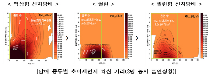 액상형 전자담배의 초미세먼지 배출 농도는 1개비(액상 0.2g)당 17만2845㎍로, 궐련(1만4415㎍)의 12배에 달했다. 궐련형 전자담배는 3100㎍로 더 낮았다. 확산 거리는 액상형 전자담배, 궐련형 전자담배, 궐련 순이었다. 다만, 냄새와 불쾌감은 궐련이 제일 심했고 액상형 전자담배, 궐련형 전자담배 순으로 확인됐다.