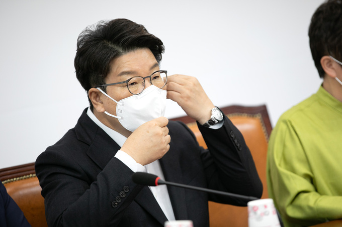 권성동 국민의힘 당 대표 직무 대행 겸 원내대표가 25일 서울 여의도 국회에서 열린 최고위원회의에 참석해 마스크를 쓰고 있다. 공동취재 사진 |