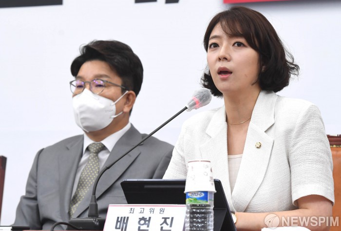 [서울=뉴스핌] 최상수 기자 = 배현진 국민의힘 최고위원이 지난 18일 서울 여의도 국회에서 열린 최고위원회의에서 발언을 하고 있다. 2022.07.18 kilroy023@newspim.com |