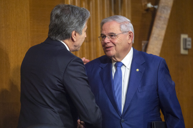 밥 메넨데스 미국 상원 외교위원장(오른쪽)이 4월 26일(현지시간) 미국 워싱턴 D.C. 연방의사당에서 토니 블링컨 미국 국무부 장관과 악수하고 있다./사진=AFP=연합뉴스 |