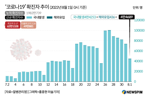 질병관리청 중앙방역대책본부(방대본)에 따르면, 1일 자정 기준 신규 확진자는 국내 4만4253명, 해외 436명으로 총 4만4689명이다.