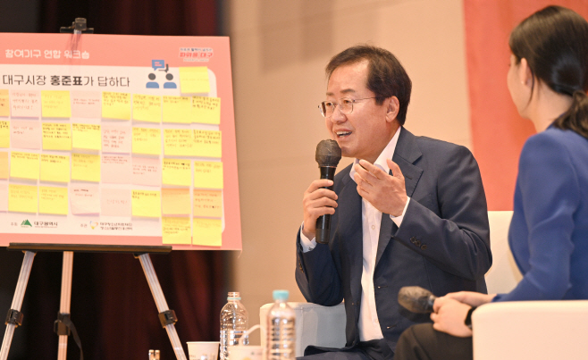 홍준표 대구시장이 지난달 29일 대구 북구 경북대학교 글로벌플라자에서 열린 '2022년 대구 청소년참여기구 연합 워크숍'에서 참석자들의 질문에 답하고 있다. /사진=대구시 |