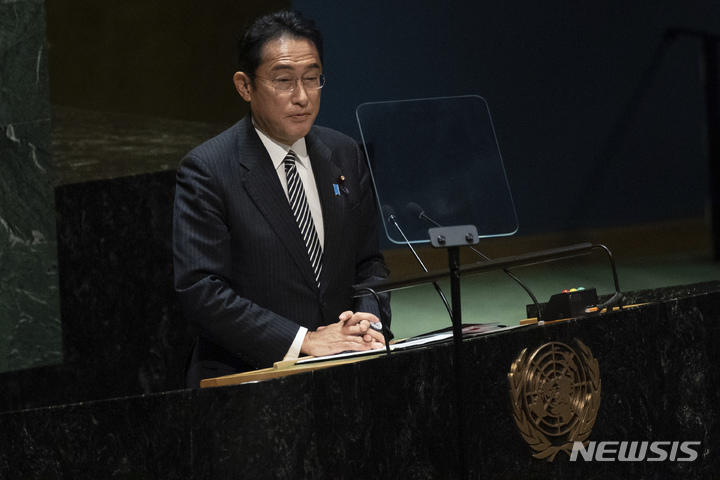 [뉴욕=AP/뉴시스] 기시다 후미오 일본 총리가 1일(현지시간) 미국 뉴욕 유엔 본부에서 열린 핵확산금지조약(NPT) 평가회의에서 연설하고 있다. 2022.08.01 |