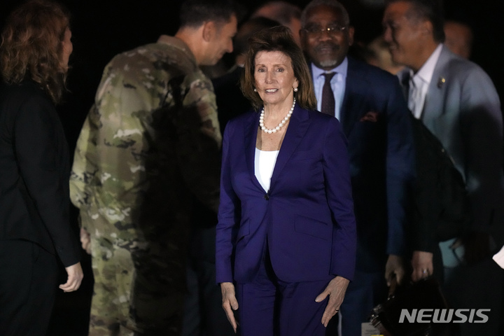 [도쿄=AP/뉴시스]지난 4일 밤 일본 도쿄 인근 요코타 미군 공군기지에 낸시 펠로시 미국 하원의장이 도착해 걸어가고 있다. 2022.08.05. |