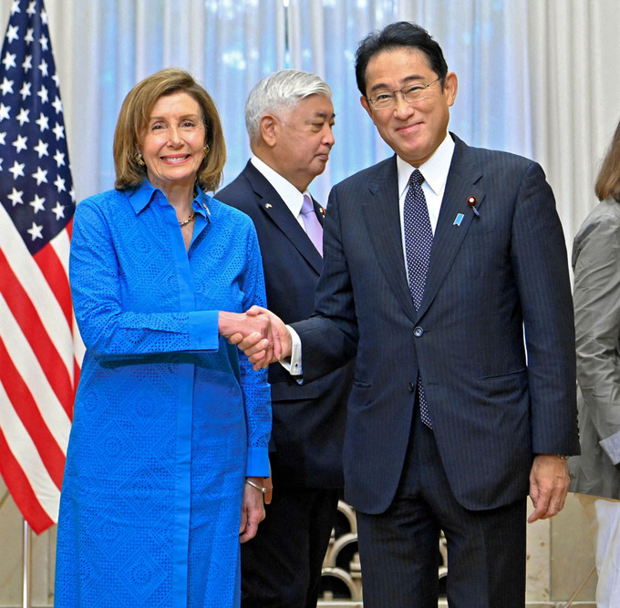 5일 일본을 방문한 낸시 펠로시 미국 하원의장이 도쿄의 총리 관저에서 조찬 회동에 앞서 기시다 후미오 총리와 악수하고 있다. 교도 통신 제공 |