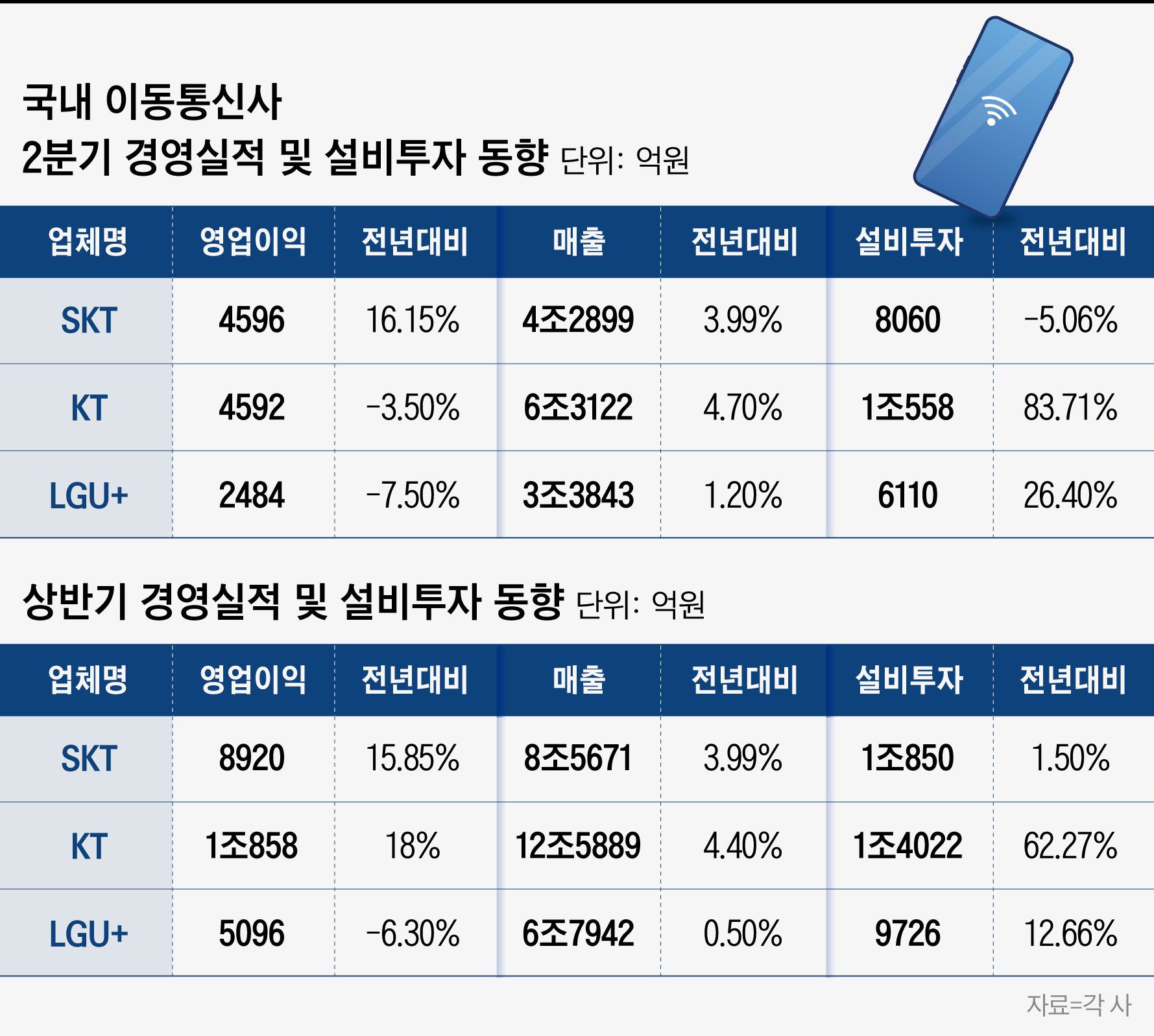같은 기간 영업이익 두 자릿수 성장세를 기록한 SK텔레콤의 경우 오히려 2분기 설비투자 금액을 전년보다 5% 줄였다. SK텔레콤은 지난 1분기 영업이익률 10.11%를 기록한 데 이어 2분기에도 10.79%로 수익성 향상을 지속하는 중이다.