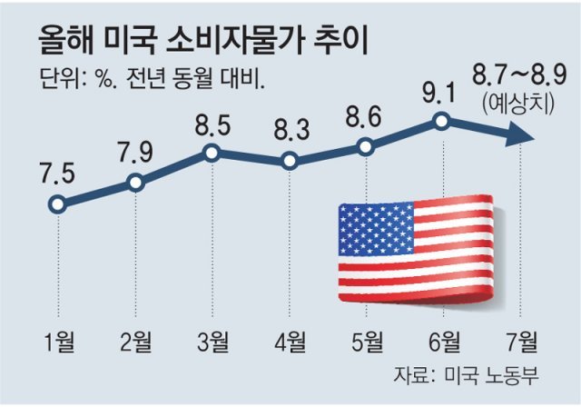 미 노동부는 10일 7월 소비자물가가 지난해 같은 달보다 8.5% 올랐다고 밝혔다. 1981년 후 41년 만에 최고치였던 6월(9.1%)보다 낮고 당초 8.7∼8.9%를 예상했던 월가 전망치도 하회했다. 7월 미 휘발유 가격이 한 달 전보다 7.7% 하락한 것이 예상보다 낮은 소비자물가를 이끌었다는 분석이 나온다.
