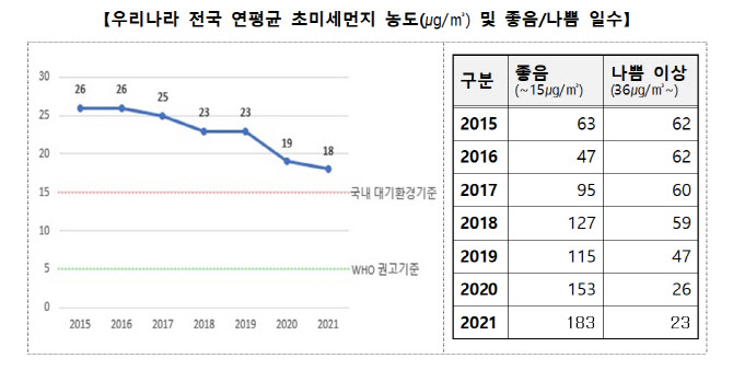 우리나라의 지난해 전국 초미세먼지 평균 농도는 18㎍/㎥로 2015년 전국 단위로 관측을 시작한 이후 약 30.7% 개선됐다. 하지만 초미세먼지 농도는 여전히 대기환경기준(15㎍/㎥)을 초과하고, 경제협력개발기구(OECD) 가입국 중 최하위권(38개국 중 35위)이다.