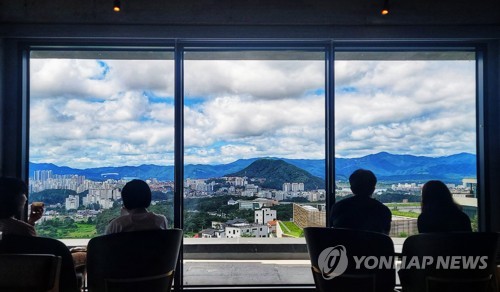(춘천=연합뉴스) 양지웅 기자 = 강원지역에 발효된 호우특보가 모두 해제된 10일 오후 춘천시 구봉산의 한 카페에서 바라본 도심 위로 뭉게구름과 파란 하늘이 어우러져 있다. 2022.8.10 |