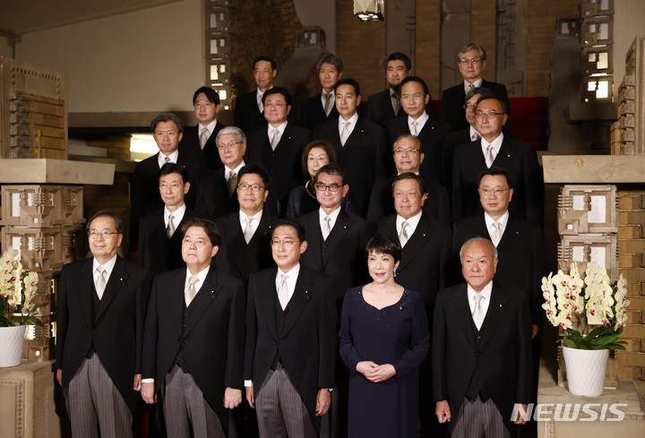 [도쿄=AP/뉴시스]10일 일본 도쿄의 총리 관저에서 기시다 총리와 새로운 내각의 각료들이 기념 촬영에 임하고 있다. 기시다 총리는 이날 개각과 집권 자민당 간부 인사를 단행했다. 근본적인 방위력 강화를 강조했다. 사진의 맨 앞줄 가운데가 기시다 총리. 2022.08.10. |