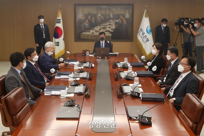 이창용 한국은행 총재가 25일 서울 중구 한국은행에서 열린 금융통화위원회 본회의를 주재하고 있다. 사진공동취재단 |