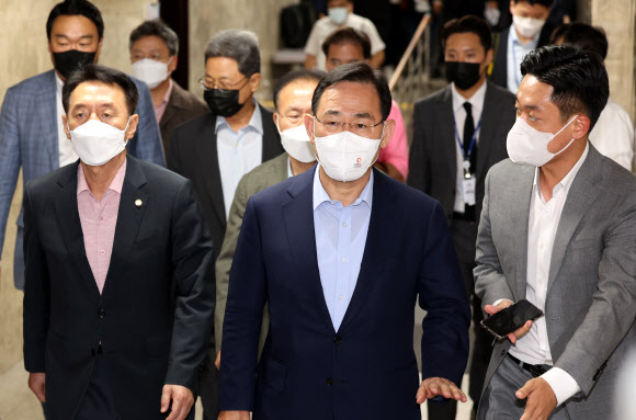 주호영(가운데) 국민의힘 비상대책위원장이 지난 27일 국회에서 열린 의원총회에 참석하고 있다.서울 연합뉴스 |