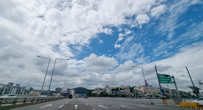 비예보가 있었던 지난 2일 한남대교에서 바라본 하늘이 구름이 걷히며 잠시 파란하늘을 보이고 있다.[사진 = 이승환 기자] |