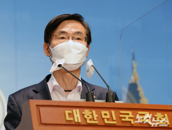 조경태 국민의힘 의원이 28일 서울 여의도 국회 소통관에서 권성동 원내대표의 사퇴와 현 지도부의 대승적 결단을 촉구하는 기자회견을 하고 있다. 박종민 기자 |