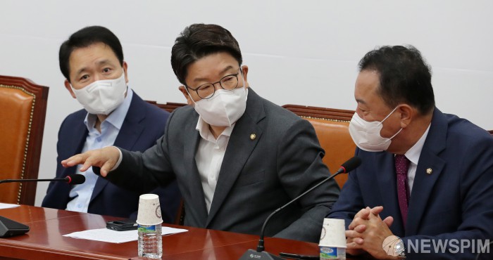 [서울=뉴스핌] 최상수 기자 = 국민의힘 권성동 원내대표가 29일 서울 여의도 국회에서 열린 비상대책위원회의에 참석, 비공개 전환 후 참석자들과 이야기를 나누고 있다. (공동취재사진) 2022.08.29 photo@newspim.com |