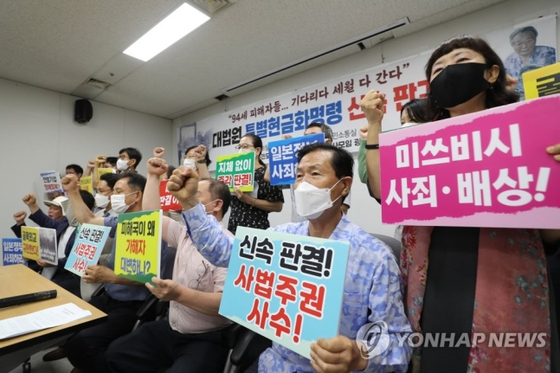 일제강제동원시민모임 활동가들이 지난 11일 광주시의회 시민소통실에서 기자회견을 열고 대법원의 신속 판결을 촉구하고 있다. (사진=연합뉴스) |