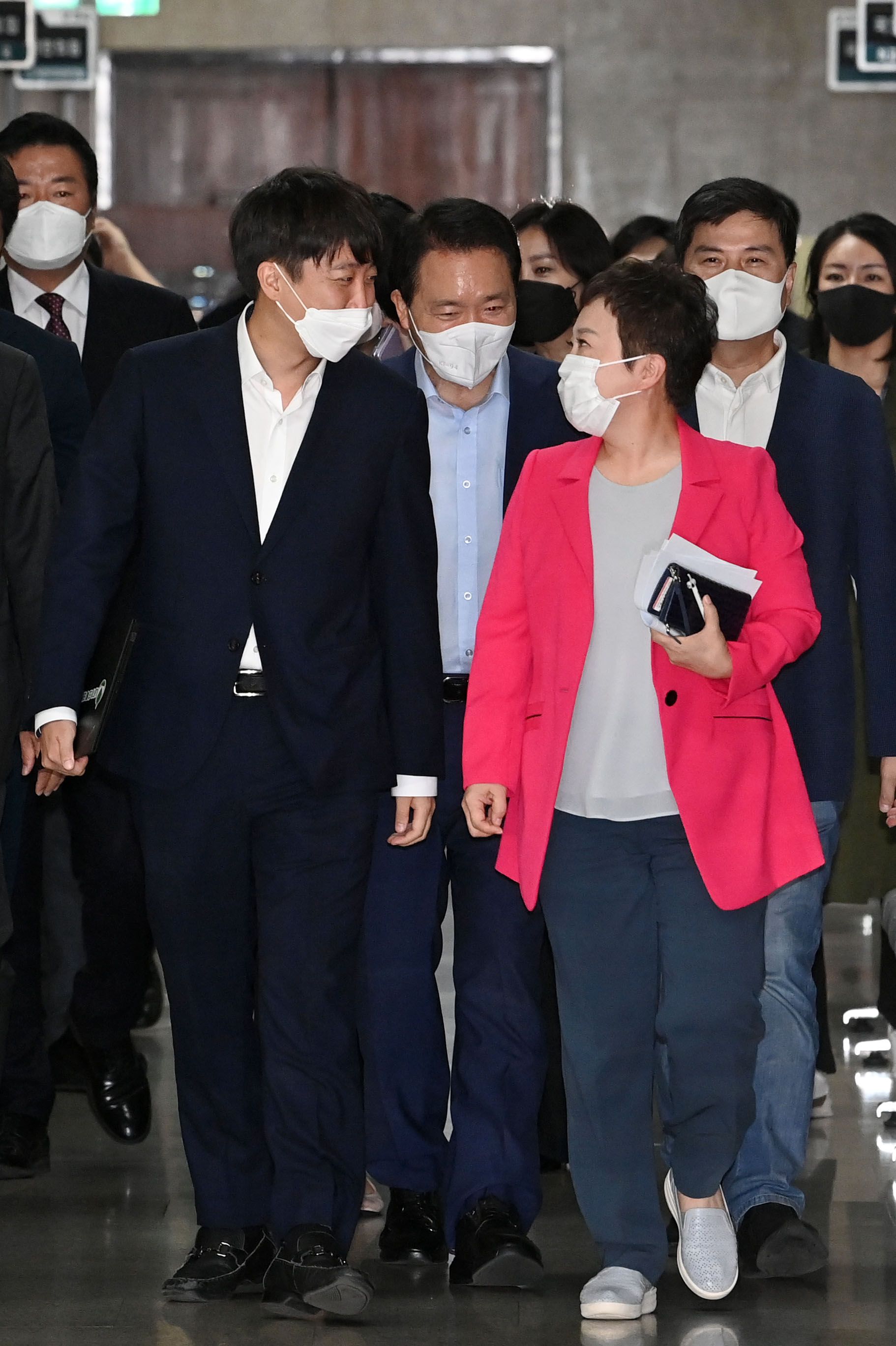 이준석 국민의힘 대표와 정미경 전 최고위원이 5월6일 서울 여의도 국회에서 열린 최고위원회의에 대화하며 입장하고 있다./국회사진기자단 |