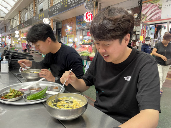 국민의힘 이준석 전 대표가 30일 오후 대구 동구 방촌시장을 찾아 칼국수를 먹고 있다. 2022.8.30 연합뉴스 |