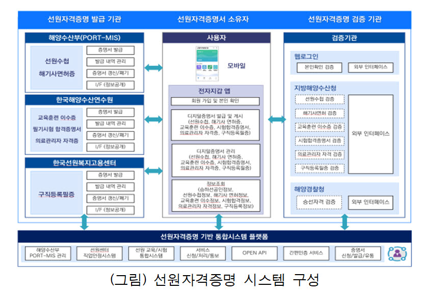 지금까지 선원들은 해양수산부, 해양수산연수원 등 다양한 발급기관이 제공한 여러 종류의 선원 관련 자격정보를 종이문서 형태로 발급받아 직접 휴대해야만 했다. 각 발급기관도 종이 증명서 발급 민원 업무가 큰 비율을 차지해왔다. 이에 해운민원서비스 부문의 비대면 업무처리에 대한 요구와 디지털 전환의 필요성이 제기돼왔다.