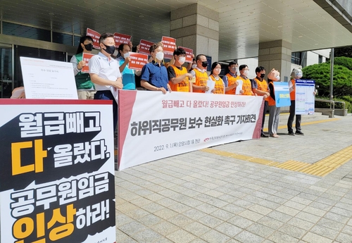 노조는 기자회견문에서 "공무원 보수 인상률이 2021년 0.9%, 2022년 1.4%인데 같은 기간 물가 인상률을 고려하면 실질임금이 4.7% 삭감된 셈"이라며 "그런데도 정부가 내년도 공무원 보수를 고작 1.7% 인상하겠다고 결정했다"고 비판했다.