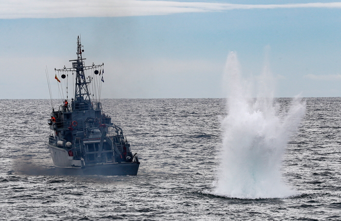러시아 소해정(기뢰를 찾아 제거하는 배)이 5일(현지시간) 러시아 블라디보스토크 인근에서 진행한 다국적 군사훈련 ‘보스토크 2022’에서 기뢰를 파괴하고 있다. EPA연합뉴스 |