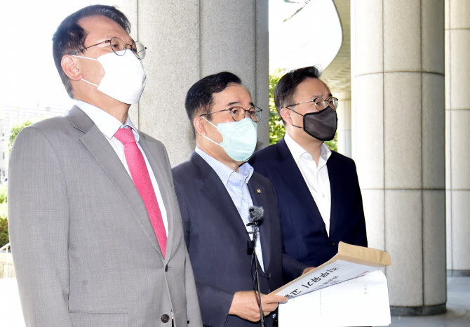 윤두현(왼쪽부터), 박성중, 홍석준 국회 과학기술정보방송통신위원회 소속 국민의힘 의원들이 7일 오전 서울 서초구 대검찰청에서 MBC·TBS ‘봐주기 심의’와 관련해 정연주 방송통신심의위원장에 대한 고발장을 제출하기 전 취재진 질문에 답변하고 있다. (사진=뉴스1) |