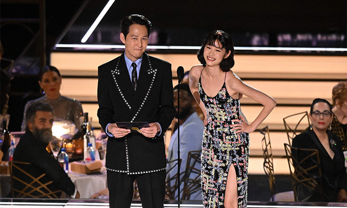 드라마 '오징어 게임'의 주연 배우 이정재(왼쪽)와 정호연이 12일(현지시간) 미국 로스앤젤레스 마이크로소프트 시어터에서 열린 제74회 에미상 시상식 '버라이어티 스케치 시리즈' 시상자로 나서고 있다. 로스앤젤레스=AFP연합뉴스 |