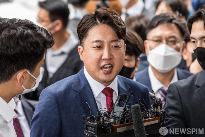 [서울=뉴스핌] 국회사진취재단 = 이준석 전 국민의힘 대표가 14일 서울 양천구 서울남부지방법원에서 열린 국민의힘 당헌 효력 정지 가처분 심문에 출석하며 입장을 말하고 있다. 2022.09.14 photo@newspim.com |