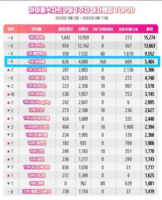 임영웅은 16일 발표된 아이돌차트 9월 1주차(22.9.5~22.9.11) 아차랭킹에서 음원점수 626점, 유튜브 점수 4009점, 소셜점수 609점 등 총점 5404점으로 전체4위,솔로가수 1위를 기록 했다.