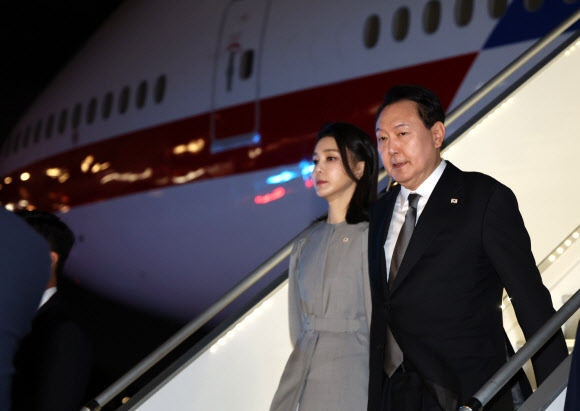 윤석열 대통령과 김건희 여사가 19일(현지시간) 미국 뉴욕 JFK 국제공항에 도착, 공군 1호기에서 내리고 있다. 2022.9.20 연합뉴스 |