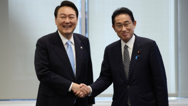 윤석열 대통령과 기시다 후미오 일본 총리가 21일(현지시각) 2년9개월만에 약식으로라도 마주 앉았다. 두 정상이 만나 “양국 관계 개선의 필요성을 공감한다. 정상 간 소통도 계속해 나가기로 했다”고 밝혔으나 이후 기시다 총리는 공식적인 한일회담에 냉랭한 반응이다.
