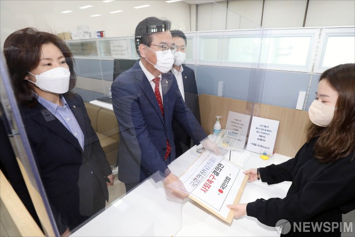 [서울=뉴스핌] 최상수 기자 = 국민의힘 송언석 원내수석부대표, 김미애, 장동혁 원내대변인이 30일 오전 서울 여의도 국회 의안과에 김진표 국회의장 사퇴 촉구 결의안을 제출하고 있다. (공동취재사진) 2022.09.30 photo@newspim.com