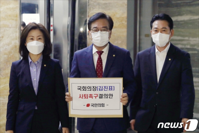 이어 "국회법상 국회의장은 당적을 보유하지 않도록 규정한다"며 "그 이유는 특정 정당이나 정파에 편중되지 말고 중립적 위치서 국회 잘 이끌어달라 취지인데 어제 김 의장은 민주당이 제기한 박 장관의 해임건의안을 국민의힘과 협의도 제대로 하지않고 일방적으로 의사일정 변경을 동의해 중립성에 대한 국회법 취지를 정면으로 배치했다"고 비판했다.