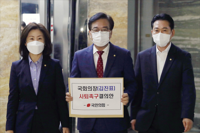 송언석 국민의힘 원내수석부대표와 김미애·장동혁 원내대변인은 이날 오전 국회 본관 의안접수센터에 김 의장 사퇴 촉구 결의안을 제출했다.