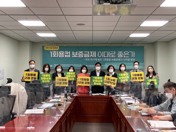 30일 국회에서 열린 ‘1회용컵 보증금제 이대로 좋은가’ 토론회에서 참가자들이 손팻말을 들고 있다. 한국환경회의 제공 |