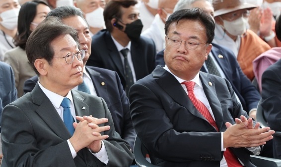 정진석 국민의힘 비상대책위원장(맨 앞줄 오른쪽)이 지난 5일 오후 서울 종로구 수송동 조계사에서 열린 대한불교조계종 제37대 총무원장 진우 스님 취임 법회에 참석, 이재명 더불어민주당 대표(〃 〃 왼쪽)를 쳐다보고 있다. 국회 사진취재단 |