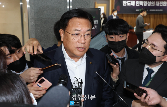 정진석 국민의힘 비상대책위원장이 11일 국회 의원회관에서 열린 ‘반도체 인력양성의 대전환! 강원도가 시작합니다’ 토론회에서 축사를 마친 뒤 취재진의 질문에 답변하고 있다./국회사진기자단 |